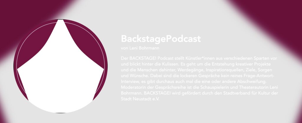 EIn Podcast der Künstler aus unterschiedlichen Sparten vorstellt, inklusive ein Blick hinter die Kulissen. "Host" (neudeutsch, Moderatorin) des Podcast ist die Schauspielerin und Theaterautorin "Leni Bohrmann".